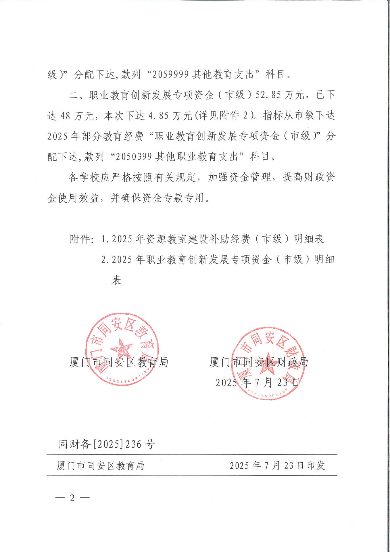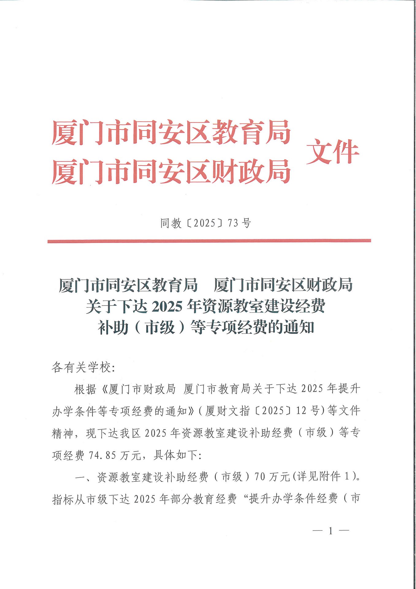 關于下達2025年資源教室建設補助經費(市級)等專項經費的通知(同教〔2025〕73號)